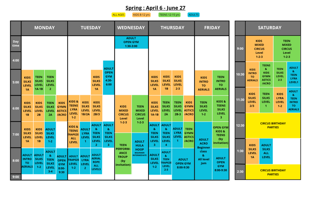 Schedule Registration is open for the Winter and Spring sessions. Join our mailing list to get a notification when a new registration period opens. Holiday closures on statutory holidays.